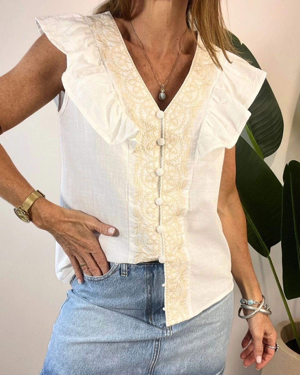 Blusa ALABAMA , una prenda importada confeccionada en un género simil lino que ofrece una textura suave y un relieve único.